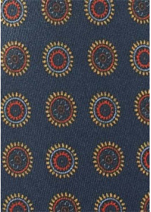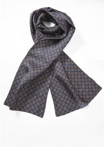 Dieser außergewöhnliche Seidenschal kombiniert wagemutige Lässigkeit mit konservativer Eleganz. Auffallende Embleme schmücken einen Hintergrund in navy.